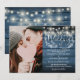 Um convite de casamento rústico com lindas luzes de corda e uma delicada guirlanda floral rústica desenhada à mão com folhagem botânica e tipografia elegante, sobre um fundo de madeira rústica azul. Personalize com sua foto especial e informações do dia do casamento. Criado por Thisisnotme©