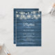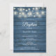 Um convite de batismo ou batizado rústico com lindas luzes de corda e seus detalhes personalizados especiais em tipografia elegante sobre um fundo de painéis de madeira azul. Criado por Thisisnotme©