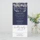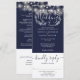 Um convite de casamento tudo-em-um com lindas luzes de corda e tipografia elegante em um fundo azul marinho. O convite inclui um cartão de RSVP que pode ser destacado e detalhes de informações dos convidados. Criado por Thisisnotme©