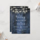 Este convite de casamento com luzes de corda de madeira de celeiro rústico azul pode ser personalizado com suas informações em tipografia moderna e um código QR do site de casamento no verso. Projetado por Thisisnotme©