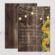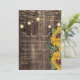Belo girassol amarelo e marrom aquarela floral e folhagem botânica convite de casamento íntimo/convite de recepção/anúncio de casamento em um fundo de madeira marrom escuro rústico com luzes de corda e uma fonte cursiva fofa. O verso deste cartão é um fundo de madeira correspondente. Entre em contato conosco para obter ajuda com personalização ou para solicitar produtos correspondentes.
