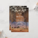 Este convite de casamento de madeira de celeiro western rústico com uma cena de montanhas de rancho western e luzes de corda em um fundo de madeira de celeiro pode ser personalizado com suas informações em tipografia elegante. Projetado por Thisisnotme