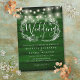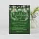 Um convite de casamento rústico com lindas luzes de corda e uma delicada guirlanda floral rústica desenhada à mão com folhagem de folhas botânicas e tipografia de roteiro estilosa, em um fundo de madeira esmeralda rústica. Personalize com as informações do seu dia especial de casamento. Criado por Thisisnotme©