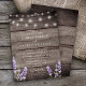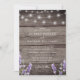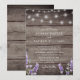 Convite de casamento com impressão em madeira rústica e luzes de corda lavanda e branca.