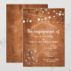 Um convite de festa de noivado country rústico com luzes de corda e um pote de pedra artesanal cheio de flores delicadas espalhadas sobre um fundo de madeira desgastada. Criado por Thisisnotme©