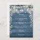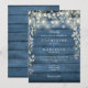 Lindas luzes de corda e uma cascata de verde floral lindo emolduram os detalhes da sua celebração de casamento especial definida em tipografia elegante em um fundo de madeira rústica azul. Criado por Thisisnotme