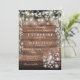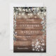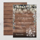 Lindas luzes de corda, jarros de pedra e uma cascata de verde floral lindo emoldura os detalhes da sua celebração de casamento especial definida em tipografia elegante em um fundo de madeira rústica. Projetado por Thisisnotme©