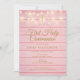Um convite rústico para a primeira comunhão com lindas luzes de corda e seus detalhes personalizados especiais em tipografia dourada elegante sobre um fundo de painéis de madeira rosa. Concebido por Thisisnotme©