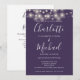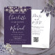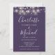 Com luzes de corda bonitas e nomes de estilo característico, este convite de casamento roxo elegante pode ser personalizado com todas as informações especiais do seu casamento na frente, detalhes do seu site de casamento e seu código QR no verso. Projetado por Thisisnotme©