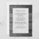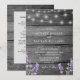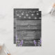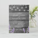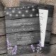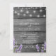 Convite de casamento com impressão em madeira rústica e luzes de corda lavanda e branca com detalhes atrás.