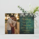 Este convite de casamento com luzes de corda de madeira rústica verde esmeralda pode ser personalizado com suas informações em tipografia dourada moderna e uma foto especial. Projetado por Thisisnotme©