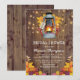 Convites rústicos de campo para chá de noiva com fundo de celeiro de madeira, folhas de outono, lanterna acesa, luzes cintilantes e um modelo de noiva moderno.