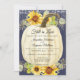"Convite de Casamento Luzes de Fada de Girassol Floral Abóbora Azul-Marinho em Madeira." Celebre seu casamento de outono com um design simples e rústico de girassóis e folhas de eucalipto com abóboras brancas pintado à mão em aquarela. Luzes de fada cintilantes sobre um fundo de madeira de celeiro azul-marinho para um design rústico e elegante.! A arte foi pintada à mão por Audrey Jeanne Roberts. Conjunto completo disponível para coordenar. Direitos autorais.