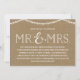 Este bonito janto de ensaio de casamento, rústico, mostra "Sr. & Sra." escrito em tipografia vintage, uma corda brilhante de luzes em forma de coração e um fundo em estilo de papel kraft.