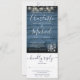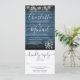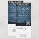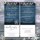 Um convite de casamento tudo em um com lindas luzes de corda e jarras de pedra, nomes de assinatura modernos e tipografia elegante em um fundo de madeira rústica azul. O convite inclui um cartão de RSVP que pode ser destacado e detalhes de informações do convidado. Criado por Thisisnotme