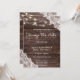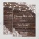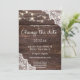 As coisas mudam. Envie aos seus convidados um belo anúncio de mudança de data do casamento devido a este convite com madeira azul e renda com luzes de corda. Ótimo para casamentos no campo e no quintal.