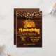 Convite de Ação de Graças com luzes da festa, abóboras, chapéus de peregrino e folhas de outono num fundo de madeira escura com texto brilhante.
