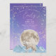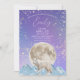Este convite de festas personalizado apresenta um tema majestoso do lobo. O fundo apresenta um céu azul, roxo e rosa gradiente que se assemelha às luzes nortes no frio inverno norte. Estrelas brilhantes rodeiam a parte de texto. Um lobo branco é fotografado percorrendo montanhas cobertas de neve. O brilho azul acentua a neve. Uma grande lua de cheio é fotografada à distância.