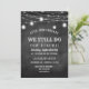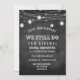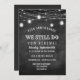 Convites de renovação de votos de aniversário rústicos no estilo country com quadro-negro - Fundo de quadro-negro com aparência antiga e vintage. A parte superior é adornada com lanternas rústicas country e vintage em jarros de Mason e luzes de corda românticas ao ar livre. Lê 'Nós Ainda Fazemos' em letras estilo western com 'Renovação de Votos' abaixo e o ano de aniversário acima em letras curvas. Os detalhes da festa de aniversário, incluindo informações de RSVP, estão abaixo. A parte traseira tem um fundo cinza carvão sólido coordenado. Nota: Todas as imagens são impressas. Não é um quadro-negro real. Use o botão Personalizar para alterar qualquer coisa - estilos de fonte, tamanhos, cores ou posicionamento. Convites românticos country para verão ou outono, festa de aniversário rústica ao ar livre, tema de casamento com quadro-negro, casamento no quintal e estilos de aniversário de casamento western ou