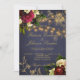 Um belo e elegante convite para casamentos no inverno rústico com flores buquês de burgundy escura e rosas de creme de marfim e peônias, cordas de luzes cintilantes, folhagem de ouro e um roteiro de caligrafia em ouro quente sobre fundo azul-escuro do quadro-negro. ++++++++++++ O convite é adequado para cerimônias e recepções de casamento elegantes de época de inverno.