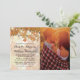 Convites de casamento de bosque outonal com uma árvore rústica de outono coberta de folhas vermelhas, laranja e amarelas, uma foto dos noivos, luzes cintilantes e um modelo de texto de casamento moderno.