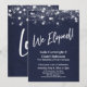 Sobre um fundo azul-marinho que pode ser alterado para qualquer cor de sua preferência, coloquei uma textura sutil de papel rústico transparente que adiciona profundidade e interesse ao papel. Em uma fonte moderna de letra manuscrita casual, criei um gráfico para a palavra "We Eloped!" (Nós Fomos Embora!). Na mesma fonte distinta, a palavra "Love" (Amor) aparece no verso. Todo o restante do texto é totalmente editável; por favor, sinta-se à vontade para usar os campos do modelo para adicionar seus detalhes e clicar para personalizar ainda mais se precisar redimensionar, reposicionar ou até mesmo alterar essa fonte. A parte superior do design é acentuada com vários gráficos diferentes que retratam uma variedade de estilos de luzes brilhantes cintilantes, adicionando um clima divertido e festivo para sua ocasião especial. Por favor, certifique-se de entrar em contato se tiver pedidos especiais ou precisar de ajuda com