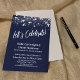 Sobre um fundo azul-marinho que pode ser alterado para a cor que preferir, coloquei uma textura de papel rústico transparente e sutil que adiciona profundidade e interesse ao papel. Em uma fonte moderna e casual de letra manuscrita, criei um gráfico para a palavra "Vamos Celebrar". Na mesma fonte distinta, a palavra "Amor" aparece no verso. Todo o restante do texto é totalmente editável; por favor, sinta-se à vontade para usar os campos do modelo para adicionar seus detalhes e clique para personalizar ainda mais se precisar redimensionar, reposicionar ou até mesmo alterar essa fonte. A parte superior do design é acentuada com vários gráficos diferentes que retratam uma variedade de estilos de luzes brilhantes cintilantes, adicionando um clima divertido e festivo para a sua ocasião especial. Por favor, certifique-se de entrar em contato se tiver pedidos especiais ou precisar de ajuda com a personalização. // 105
