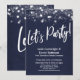 Sobre um fundo azul-marinho que pode ser alterado para qualquer cor de sua preferência, eu coloquei uma textura de papel rústico transparente sutil que adiciona profundidade e interesse ao papel. Em uma fonte moderna e casual de letra manuscrita, eu criei um gráfico para a palavra "Let's Party!". Na mesma fonte distinta, a palavra "Love" aparece no verso. Todo o outro texto é totalmente editável; por favor, sinta-se à vontade para usar os campos de modelo para adicionar seus detalhes e clicar para personalizar ainda mais se você precisar redimensionar, reposicionar ou até mesmo alterar essa fonte. A parte superior do design é acentuada com vários gráficos diferentes que retratam uma variedade de estilos de luzes brilhantes cintilantes, adicionando um clima divertido e festivo para sua ocasião especial. Por favor, certifique-se de entrar em contato se você tiver solicitações especiais ou precisar de ajuda com a personalização. //