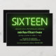 Legal convite de aniversário moderno 16º com "dezesseis" em luzes néon verdes e brilhantes contra fundo preto.