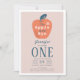Este cartão de convite para primeiro aniversario da menina "a maçã do nosso olho" bonito apresenta uma maçã vermelha com folha azul marinho sobre um fundo cor-de-rosa enquadrado por uma borda branca. O verso apresenta um fundo cor-de-rosa coral com padrões florais de maçã. Personalize-o para as suas necessidades. Você pode encontrar produtos correspondentes na minha loja.