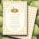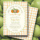 Celebre o seu pequeno convite de chá de fraldas de outono com o doce e sazonal "A Maçã do Nosso Olho", com um fundo de gingham cor de laranja quente e um charmoso trio de maçãs verdes e laranja acentuadas com um coração. Perfeito para uma comemoração neutra em termos de gênero ou para um chá para um menino ou uma menina, este design combina cores confortáveis no outono com um tema novo e brincalhão de pomares. Um quadro dimensionado destaca seus detalhes personalizados de eventos, enquanto a paleta vibrante de colheita define um tom alegre. Ideal para fazendas, pomares, ou encontros de queda rústica, este convite é uma maneira deliciosa de honrar sua mais nova maçã do olho.