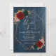 A design apresenta uma estrutura de burgundy Elegante, verde esmeralda, folhas de outono douradas e um fundo azul marinho de madeira. Personalize com seus detalhes de casamento e encontre designs correspondentes na minha loja "DreamHut".