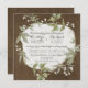 NOTA: OS CONVITES QUADRADOS EXIGEM PLACAS RSVP DE 1/2" X 5" DE TAMANHO - o tamanho maior não será ajustado nos envelopes. Um fundo de conselho de madeira de cereja profunda, rústica, com cascata, dispara a folhagem simples das folhas e o hálito do bebê, design. As folhas são folhagem acinzentada e de cor suave das folhas de galho das árvores, com suculentos, folhas de louro e ranhuras do hálito do bebê, numa moldura de coroa solta e natural. Seu texto moderno, estilo tipografia, aparece no centro da coroa e suas iniciais estão em uma versão menor do lado oposto. Também disponível no fundo médio e escuro da madeira, assim como uma cor para a sua própria opção de fundo. A trabalho de arte foi pintada manualmente por Audrey Jeanne Roberts, direitos autorais, todos os direitos reservados.