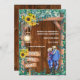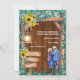 Uma bela ilustração com aquarelas, com um vaqueiro e uma vaqueira com os braços à volta uns dos outros, caminhando até a distância. Eles estão vestindo jeans de denim; camisas verificadas e chapéus de cowboy e estão colocados contra um fundo de madeira rústica e castanha escura que tem uma estrutura de madeira com verde, girassóis e um letreiro que diz "salve a data". Uma lanterna brilhante solteiro pendura de trepadores crescendo no arco. Personalize os modelos e não se esqueça de excluir o modelo extra na parte traseira do convite se ele não for necessário.