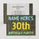 Este design de convite de aniversário divertido apresenta uma mensagem como "NAME-HERE'S aniversário de 30 anos PARTITY!", onde o nome pode ser personalizado, na frente. O fundo apresenta um padrão de aparência rústico, castanho e falso em grãos de madeira. O texto de mensagem personalizável na frente apresenta cores como azul, amarelo e verde, e tem uma aparência inspirada pelo texto pintado e estêncilhado. O verso apresenta uma mensagem personalizada que pode incluir detalhes relevantes sobre a festa de aniversário, como quando e onde ela está sendo mantida, juntamente com qualquer outra informação que seja importante. Convites de festas de aniversários como esta podem ser uma maneira divertida de convidar a família e os amigos para uma festa de aniversário que está sendo realizada para alguém que está comemorando seu trigésimo aniversário. [~Z0000291]