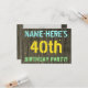 Este design de convite de aniversário divertido apresenta uma mensagem como "NAME-HERE'S aniversário de 40 anos PARTITY!", onde o nome pode ser personalizado, na frente. O fundo apresenta um padrão de aparência rústico, castanho e falso em grãos de madeira. O texto de mensagem personalizável na frente apresenta cores como azul, amarelo e verde, e tem uma aparência inspirada pelo texto pintado e estêncilhado. A parte traseira contém uma mensagem personalizada que pode incluir detalhes relevantes sobre a festa de aniversário, como quando e onde ela está sendo mantida, juntamente com qualquer outra informação que seja importante. Convites de festas de aniversários como esta podem ser uma maneira divertida de convidar a família e os amigos para uma festa de aniversário que está sendo realizada para alguém que está comemorando seu quadragésimo aniversário. [~Z0000291]