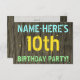 Este design de convite de aniversário divertido apresenta uma mensagem como "NAME-HERE'S 10th FESTA DE ANIVERSÁRIO!", onde o nome pode ser personalizado, na frente. O fundo apresenta um padrão de aparência rústico, castanho e falso em grãos de madeira. O texto de mensagem personalizável na frente apresenta cores como azul, amarelo e verde, e tem uma aparência inspirada pelo texto pintado e estêncilhado. O verso apresenta uma mensagem personalizada que pode incluir detalhes importantes sobre a festa de aniversário, como quando e onde ela está sendo mantida, juntamente com qualquer outra informação relevante. Convites de festas de aniversários como esta podem ser uma maneira divertida de convidar a família e os amigos para uma festa de aniversário que está sendo realizada para alguém que está comemorando seu décimo aniversário. [~Z0000291]