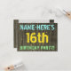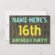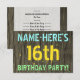 Este design de convite de aniversário divertido apresenta uma mensagem como "NAME-HERE'S 16th FESTA DE ANIVERSÁRIO!", onde o nome pode ser personalizado, na frente. O fundo apresenta um padrão de aparência rústico, castanho e falso em grãos de madeira. O texto de mensagem personalizável na frente apresenta cores como azul, amarelo e verde, e tem uma aparência inspirada pelo texto pintado e estêncilhado. A parte traseira contém uma mensagem personalizada que pode incluir detalhes relevantes sobre a festa de aniversário, como quando e onde ela está sendo mantida, juntamente com qualquer outra informação que seja importante. Convites de festas de aniversários como esta podem ser uma maneira divertida de convidar a família e os amigos para uma festa de aniversário que está sendo realizada para alguém que está comemorando seu décimo sexto aniversário. [~Z0000291]