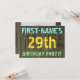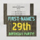 Este design convite de aniversário de divertido apresenta uma mensagem como "A 29ª FESTA DE ANIVERSÁRIO do PRIMEIRO NOME!", onde o nome pode ser personalizado, na frente. O fundo apresenta um padrão de aparência rústico, castanho e falso em grãos de madeira. O texto de mensagem personalizável na frente apresenta cores como azul, amarelo e verde, e tem uma aparência inspirada pelo texto pintado e estêncilhado. O verso apresenta uma mensagem personalizada que pode incluir detalhes importantes sobre a festa de aniversário, como quando e onde ela está sendo mantida, juntamente com qualquer outra informação relevante. Convites de festas de aniversários como esta podem ser uma maneira divertida de convidar a família e os amigos para uma festa de aniversário que está sendo realizada para alguém que está comemorando seu vigésimo nono aniversário. [~Z0000291]