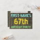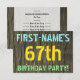 Este design convite de aniversário de divertido apresenta uma mensagem como "PRIMEIRA-NOME'S 67th FESTA DE ANIVERSÁRIO!", onde o nome pode ser personalizado, na frente. O fundo apresenta um padrão de aparência rústico, castanho e falso em grãos de madeira. O texto de mensagem personalizável na frente apresenta cores como azul, amarelo e verde, e tem uma aparência inspirada pelo texto pintado e estêncilhado. A parte traseira contém uma mensagem personalizada que pode incluir detalhes importantes sobre a festa de aniversário, como quando e onde ela está sendo mantida, juntamente com qualquer outra informação relevante. Convites de festas de aniversários como esta podem ser uma maneira divertida de convidar a família e os amigos para uma festa de aniversário que está sendo realizada para alguém que está comemorando seus sessenta e sete anos. [~Z0000291]