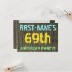 Este design convite de aniversário de divertido apresenta uma mensagem como "PRIMEIRO NOME'S 69th FESTA DE ANIVERSÁRIO!", onde o nome pode ser personalizado, na frente. O fundo apresenta um padrão de aparência rústico, castanho e falso em grãos de madeira. O texto de mensagem personalizável na frente apresenta cores como azul, amarelo e verde, e tem uma aparência inspirada pelo texto pintado e estêncilhado. O verso apresenta uma mensagem personalizada que pode incluir detalhes relevantes sobre a festa de aniversário, como quando e onde ela está sendo mantida, juntamente com qualquer outra informação que seja importante. Convites de festas de aniversários como esta podem ser uma maneira divertida de convidar a família e os amigos para uma festa de aniversário que está sendo realizada para alguém que está comemorando seu sexagésimo nono aniversário. [~Z0000291]