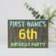 Este design convite de aniversário de 6 divertido apresenta uma mensagem como "FESTA DE ANIVERSÁRIO do PRIMEIRO NOME!", onde o nome pode ser personalizado, na frente. O fundo apresenta um padrão de aparência rústico, castanho e falso em grãos de madeira. O texto de mensagem personalizável na frente apresenta cores como azul, amarelo e verde, e tem uma aparência inspirada pelo texto pintado e estêncilhado. A parte traseira contém uma mensagem personalizada que pode incluir detalhes relevantes sobre a festa de aniversário, como quando e onde ela está sendo mantida, juntamente com qualquer outra informação que seja importante. Convites de festas de aniversários como esta podem ser uma maneira divertida de convidar a família e os amigos para uma festa de aniversário que está sendo realizada para alguém que está comemorando seu sexto aniversário. [~Z0000291]