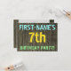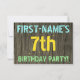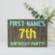 Este design convite de aniversário de 7 divertido apresenta uma mensagem como "FESTA DE ANIVERSÁRIO do PRIMEIRO NOME!", onde o nome pode ser personalizado, na frente. O fundo apresenta um padrão de aparência rústico, castanho e falso em grãos de madeira. O texto de mensagem personalizável na frente apresenta cores como azul, amarelo e verde, e tem uma aparência inspirada pelo texto pintado e estêncilhado. A parte traseira contém uma mensagem personalizada que pode incluir detalhes importantes sobre a festa de aniversário, como quando e onde ela está sendo mantida, juntamente com qualquer outra informação relevante. Convites de festas de aniversários como esta podem ser uma maneira divertida de convidar a família e os amigos para uma festa de aniversário que está sendo realizada para alguém que está comemorando seu sétimo aniversário. [~Z0000291]
