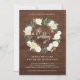 Estes elegantes convites para o casamento apresentam um fundo de madeira castanha, e uma coroa floral de marfim e água dourada com folhas verdes. Sua foto pessoal vai atrás com uma bela borda floral.