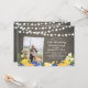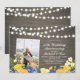 Celebre o seu dia especial com este convite de aniversário de casamento personalizado com foto. Este design apresenta lindas flores azuis e amarelas e luzes de corda em um fundo de madeira rústica. Você pode personalizar o texto para qualquer ano. Substitua a foto de amostra pela sua própria foto. Suprimentos para festa combinando disponíveis na minha loja BaraBomDesign.