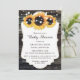 Um convite giro para madeira rústica e chá de fraldas de girassol apresentando girassóis em um fundo de madeira de celeiro adornado com luzes de cordas. Itens correspondentes disponíveis.