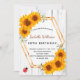 Para uma festa de aniversário de 50ª (ou qualquer idade). Um fundo de madeira branco rústico, decorado com girassóis. Um falso quadro geométrico dourado e uma bela joaninha vermelha. Personalize e adicione o nome, a idade e os detalhes da festa na frente.