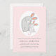 Bonita mãe de coelho e bebê bebezinho rosa convite para chá. Este adorável convite para chás de fraldas mostra uma doce mãe de coelho ao lado do seu pequeno coelho, adornada com dois corações cor-de-rosa dentro de uma moldura oval branca. O texto é apresentado elegantemente em cinzas contra um fundo cor-de-rosa suave e rosado. Do lado oposto, um encantador padrão rosa-bolinhas adiciona um toque encantador.