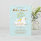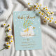 Pato-mãe doce e adorável e design pata-pau amarelo-bebê azul-claro apresentando nossa ilustração desenhada à mão de um pato-mãe e bebê sob um guarda-chuva azul-claro-chic e um guarda-chuva de bolinhas dourada-falsa. O pequeno pato-bebê amarelo está aninhado nas asas do pato-mãe protegido sob o guarda-chuva. Um fundo azul claro, com sutis gotas de chuva brancas caindo, está organizado em torno da parte superior do design. A beleza da tipografia da escrita de pincéis de ouro falsos complementares complementa as bolinhas de ouro. O verso apresenta o sutil padrão de chuva branco. Todas as ilustrações contidas no nosso convite de chá de fraldas de patos-mãe e de patos-amarelos são obras de arte originais feitas à mão pela Moodthology.