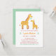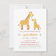 Uma bela ilustração de uma girafa de vitelos e bebês com girafa de mamãe pegando um caule de folhas para alimentar a pequena. Celebre a chegada rápida do pequeno com este adorável e neutro convite para chás de fraldas.